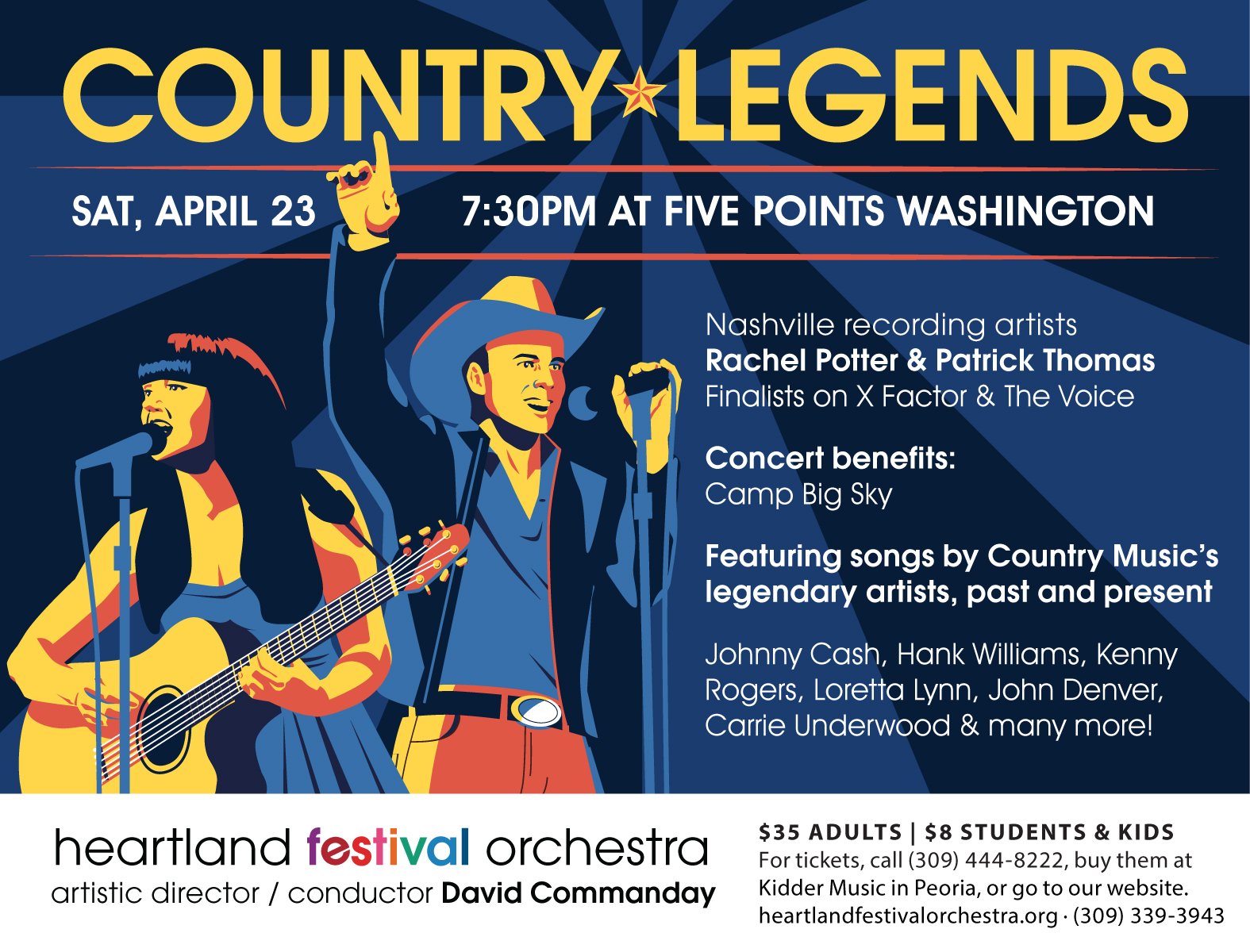 Your favorite hits from the biggest names in country music combine with the magnificent sound of the Heartland Festival Orchestra for a memorable evening of great entertainment. Country Legends Symphony. A foot-stompin’, toe tappin’ tribute to the greatest names in country music, including songs by famed singers and songwriters like Johnny Cash, Hank Williams, Kenny Rogers, Dolly Parton, Carrie Underwood, and Faith Hill. Features the Heartland Festival Orchestra with Nashville recording artists Rachel Potter and Patrick Thomas. Join us for such country classics as Crazy, Joline, Ring of Fire, On The Road Again, Devil Went Down To Georgia, and many more. Concert co-sponsored by The Schwebel Family in memory of Richard A. Schwebel |