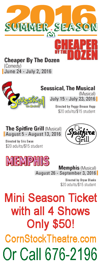 Cheaper By the Dozen continues Friday night at the Corn Stock Theatre (located in upper Bradley Park) beginning at 7:30 pm through Saturday. Enjoy the famous story of a large family and their time efficiency father made famous by the recent movie, tickets are $15 for adults and $12 for students aged 18 and under with ID and are available at the Corn Stock box office, by calling 309-676-2196 or online at www.CornStockTheatre.com