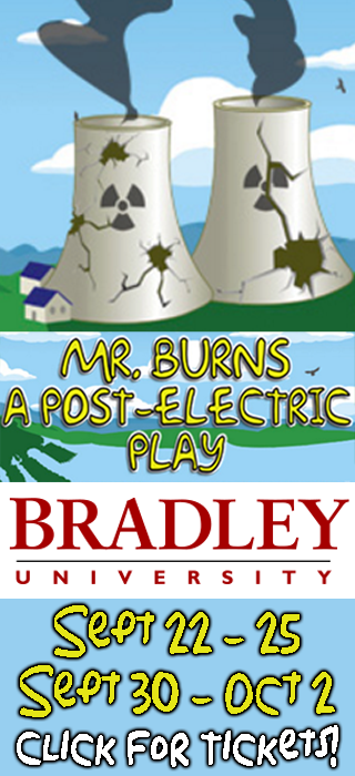 Play continues at the Hartmann Center for the Performing Arts at Bradley University Theatre beginning at 8 pm tonight (Thursday) through Saturday and at 2:30 pm on Sunday. Part thriller, part musical, Mr. Burns asks how the stories we tell make us the people we are. In a near future where a cataclysmic series of nuclear disasters has left America without electricity, infrastructure, or mass communication, a small group of survivors huddles around a fire trying to remember the dialogue