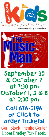 Music Man by Corn Stock for Kids continues at the Corn Stock Theatre Center (located in upper Bradley Park) beginning at 7:30 pm on Friday and at 2:30 pm on Saturday. The classic musical features favorite songs "Wells Fargo Wagon", "Trouble", "Seventy-Six Trombones" and "Shipoopie". Tickets are $14 for adults and $8 for children 12 and under and are available at the Corn Stock box office, by calling 309-676-2196 or online at www.CornStockTheatre.com