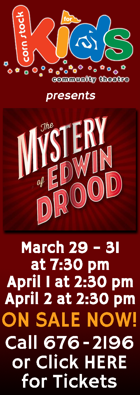 (Thursday) & Friday and at 2:30 pm on Saturday & Sunday. An unfinished work by Charles Dickens, the show is a murder mystery with a choice of 4 different improvised endings which will be selected by the audience. Tickets are $10 for adults and $6 for children 12 and under and more information, visit www.cornstocktheatre.com