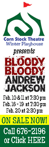 Bloody Bloody Andrew Jackson opens at the Corn Stock Winter Playhouse in upper Bradley Park on Friday and also runs on Saturday beginning at 7:30 pm plus continues next Thursday - Saturday at 7:30 pm and at 2:30 pm on Sunday, February 19. The show is as an emo-laced anachronistic rock invocation of the seventh U.S. President set in