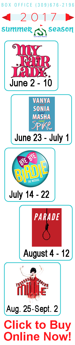 lovely Eliza Doolittle, who agrees to speech lessons to improve her job prospects. Higgins and Eliza clash, then form an unlikely bond. Tickets are $22 for adults and $17 for students aged 18 and under with ID and are available at the Corn Stock box office, by calling 309-676-2196 or online at www.CornStockTheatre.com