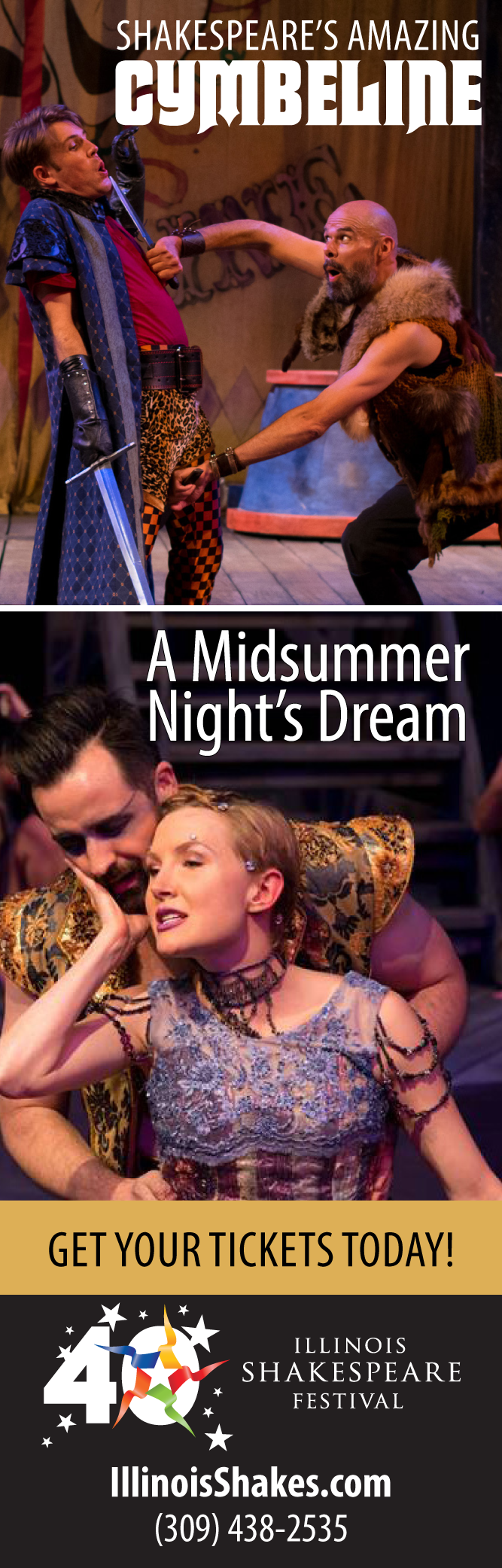 The 2017 Illinois Shakespeare Festival continues at Ewing Manor in Bloomington Tuesdays through Sundays through August 12. Shows include A Midsummer Night's Dream, Shakespeare's Amazing Cymbeline and I Heart Juliet (this show is sold out) plus The Improvised Shakespeare Company which is presented on Tuesdays. Tickets range from $16 to $49 and are available by calling 309-438-2535 Monday through Friday from Noon - 4 pm, at the on site box
