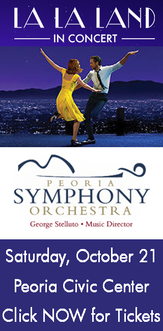 La La Land in Concert will be presented by the Peoria Symphony at the Peoria Civic Center Theater on Saturday beginning at 7:30 pm. Featuring the film played on a large screen on stage with the original voices singing and speaking, the score will be played live by the Peoria