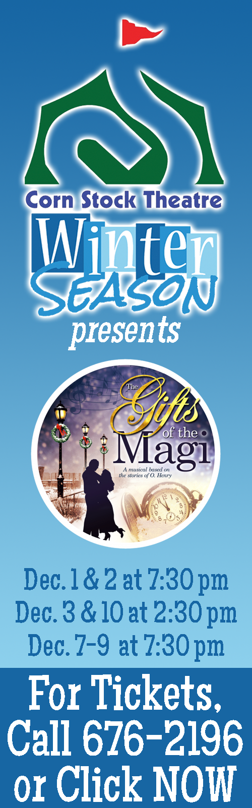 Gifts of the Magi continues as part of Corn Stock Theatre's Winter Season (Iocated in upper Bradley Park) beginning at 7:30 pm tonight (Thursday), Friday and Saturday and at 2:30 pm on Sunday. A musical based on a