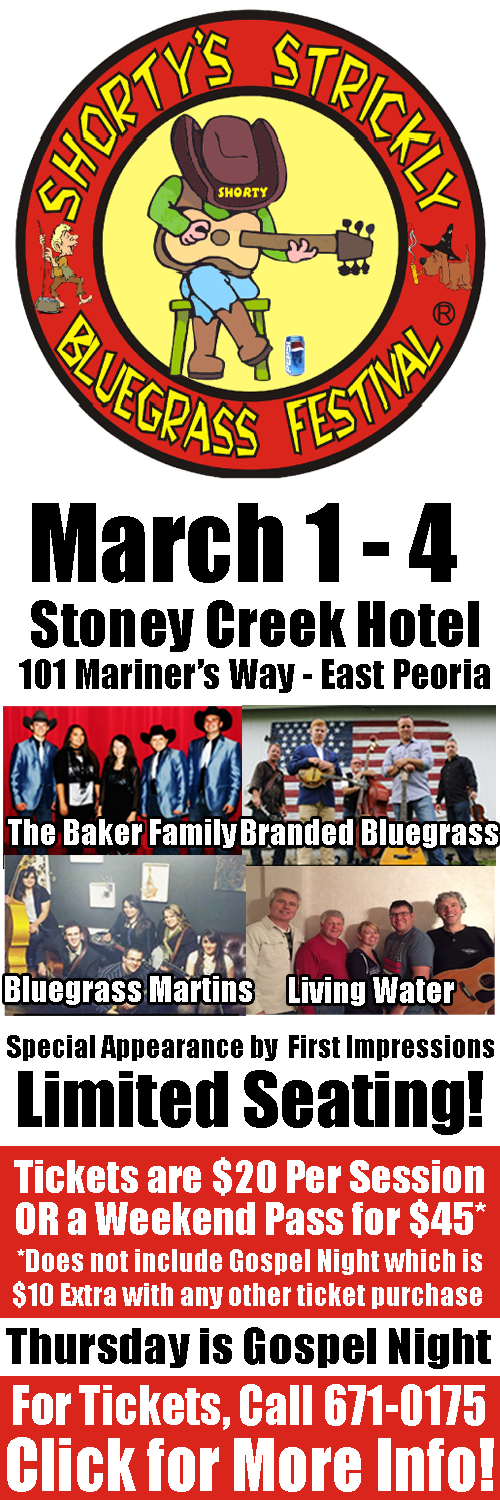 Festival will take place at the Stoney Creek Inn (located at 101 Mariner's Way in East Peoria) at 7 pm tonight (Thursday - Gospel), at 7 pm on Friday, at 1 pm and 7 pm on Saturday plus a Sunday Morning Gospel performance beginning at 9:30 am. Tickets are $20 per show except the Thursday show which is $10 with any other ticket purchase. For more information, call 309-671-0175 or visit http://shortysbluegrass.com |
