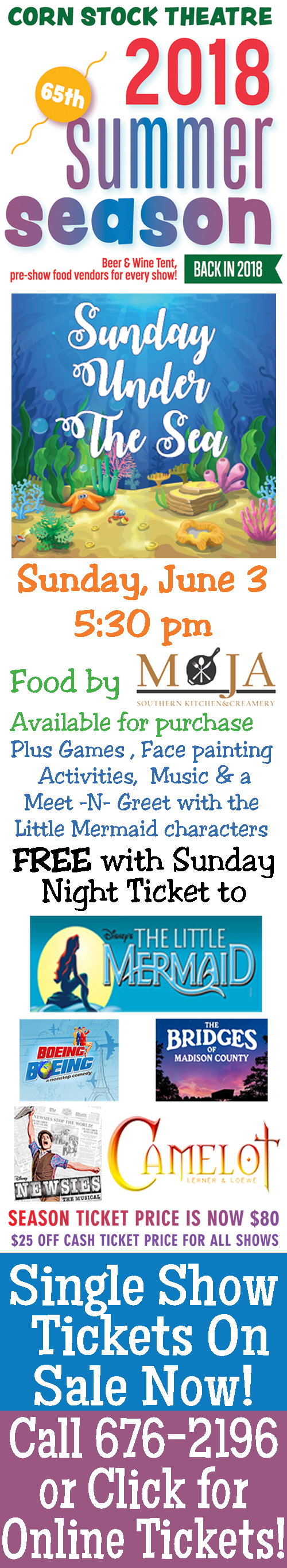 Disney's The Little Mermaid opens Friday at Corn Stock Theatre (located in upper Bradley Park) beginning at 7:30 pm each night through Sunday, June 9. Featuring all of your favorite "under the sea" tunes from the movie with the iconic characters like Flounder, Sebastian and Scuttle plus the villain, Ursula live on stage, tickets are