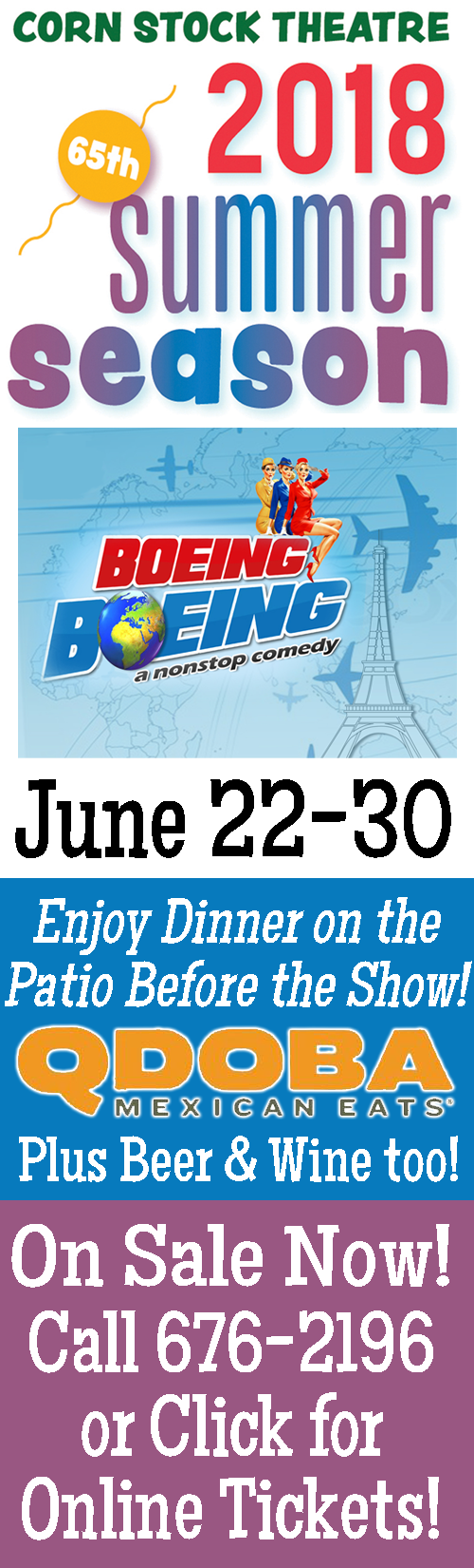 Boeing, Boeing opens on Friday at Corn Stock Theatre and runs through Saturday, June 30 at 7:30 pm each night. A French farce about a bachelor living in Paris who's juggling three fiancees who are all flight attendants, the slapstick comedy is a stage version of a famous movie starring Tony Curtis & Jerry Lewis. Tickets are $17 for adults