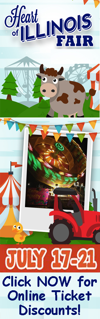 The Heart of Illinois Fair continues at Expo Gardens (located at 1601 West Northmoor Road in Peoria) today (Thursday) through Saturday. Attractions include a carnival, live entertainment, tractor pulls, a demolition derby and much more. General admission is $10 for ages 13 & over, $5 for children aged 6 - 12 and free for ages under 6 and