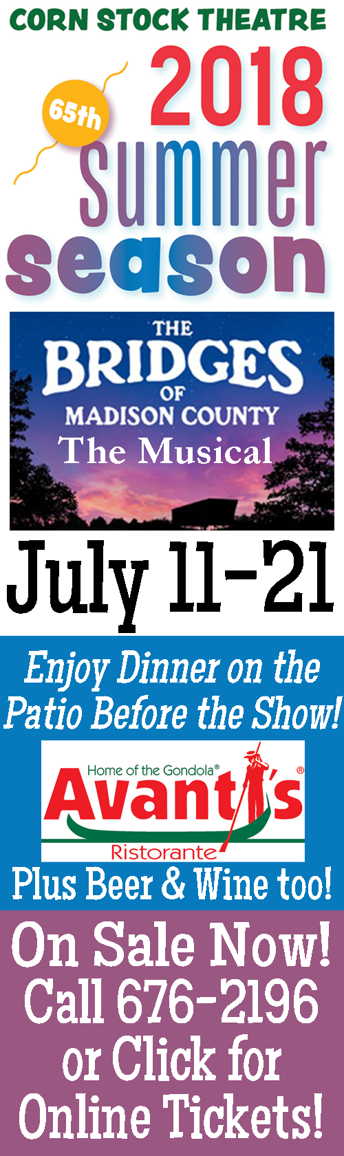 The Bridges of Madison County continues at Corn Stock Theatre (located in upper Bradley Park) tonight (Thursday) through Sunday beginning at 7:30 pm. The musical version of the popular book and movie, the story follows Francesca Johnson, a beautiful Italian woman who married an American soldier to flee war-ravaged Italy, who looks