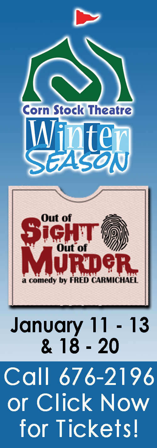 Out of Sight, Out of Murder continues at Corn Stock Theatre's Theatre Center (Iocated in upper Bradley Park) on Friday and Saturday at 7:30 pm and on Sunday at 2:30 pm. Tickets are $14 for adults & $10 for students through high school and are available at the Corn Stock box office, by calling 309-676-2196 or online at www.CornStockTheatre.com