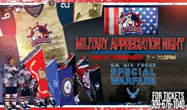 | The Rivermen will take on the Quad City Storm and the first 1,000 fans will receive a 2 oz. bag of Rivermen Coffee Blend from CXT Roasting. All veterans and military personnel can get a buy one, get one free ticket special by calling 309-676-1040 or visiting the Rivermen office. Plus there will also be a veterans camo jersey post-game jersey auction. |