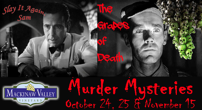 The Murder Mystery Slay it Again Sam will be presented on October 24 & 25 and The Grapes of Death will be presented on November 15. Both begin with a cast “mingle” from from 5:30 - 6:30 pm followed by the show, a dinner buffet and dessert. |