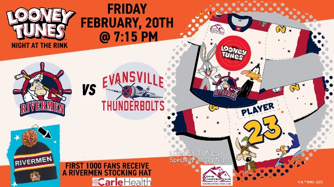 | The first 1,000 fans at the game on Friday will receive a Rivermen Stocking Cap plus there will be a post-game custom Looney Tunes jersey auction. |