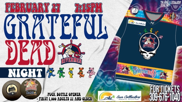 | Friday is Grateful Dead Night featuring custom jerseys plus a puck bottle opener for the first 1,000 adults 21+ into the game. And Saturday is Super Heroes DC Comics Night with custom jerseys plus the first 2,000 fans into the game will receive a free Caterpillar baseball cap. |
